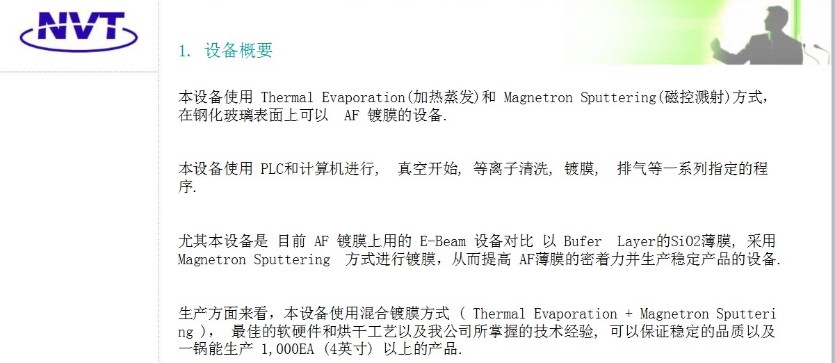 簡述: 本設備使用 Thermal Evaporation(加熱蒸發(fā))和 Magnetron Sputtering(磁控濺射)方式,在鋼化玻璃表面上可以 AF 鍍膜的設備.
